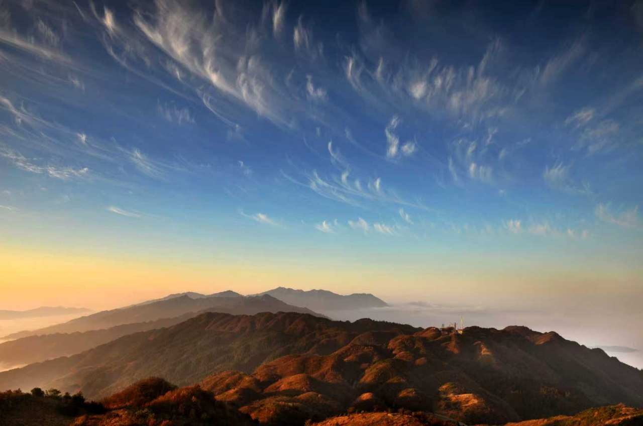 帽子岭的神奇之处,在于“一天有四季,十里不同天”。刚才还是晴空万里,转眼间云雾便从山谷间涌来,气温骤降,仿佛从深秋踏入寒冬。我们裹紧衣衫,在云雾中穿行,脚下的石阶湿滑,身旁的草木挂着晶莹的露珠。忽然,云雾散去,阳光穿透云层洒在身上,暖意融融,远处的山峰露出真容,苍翠的植被与褐色的岩石相映成趣,让人不禁感叹大自然的变幻莫测。