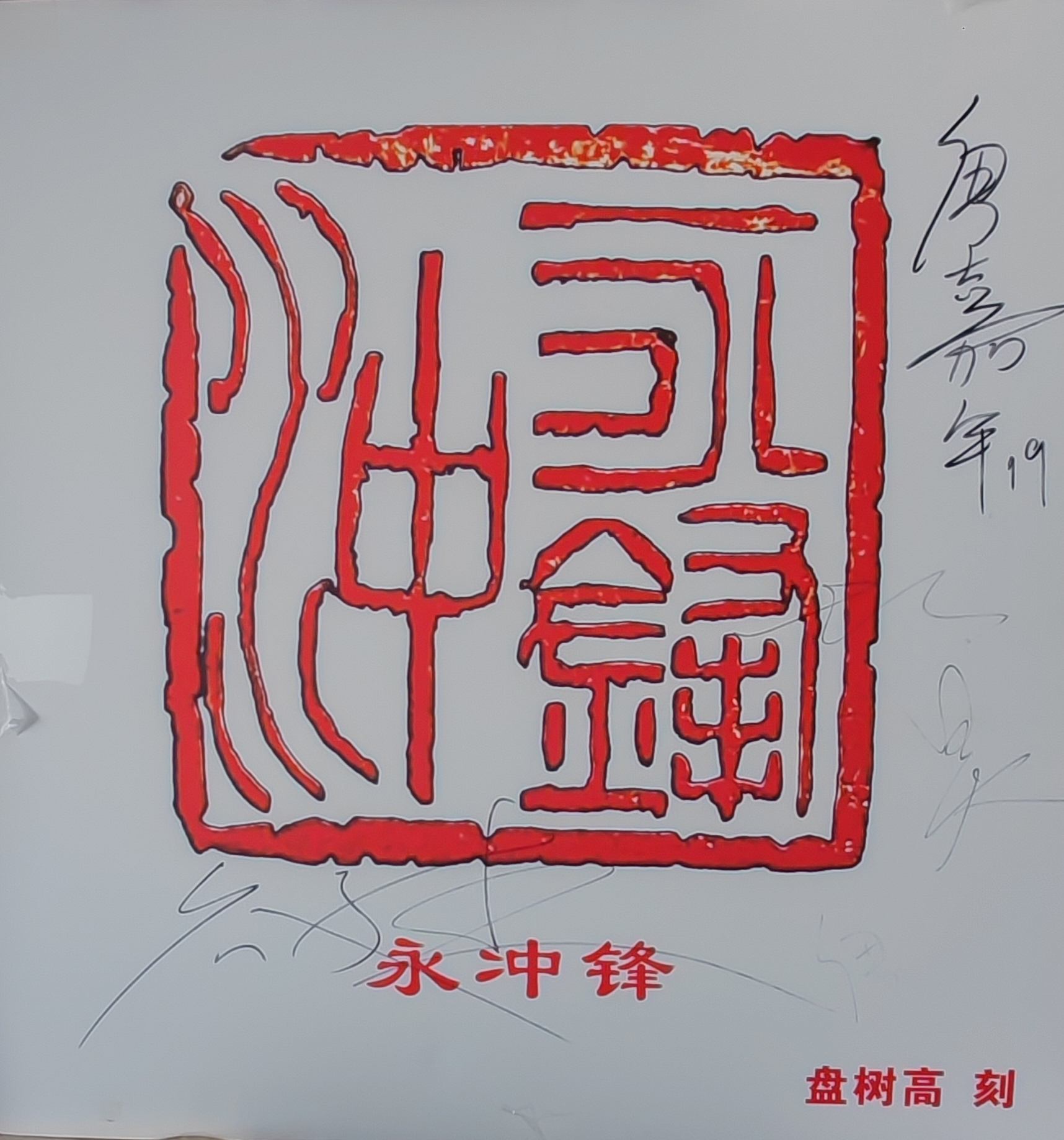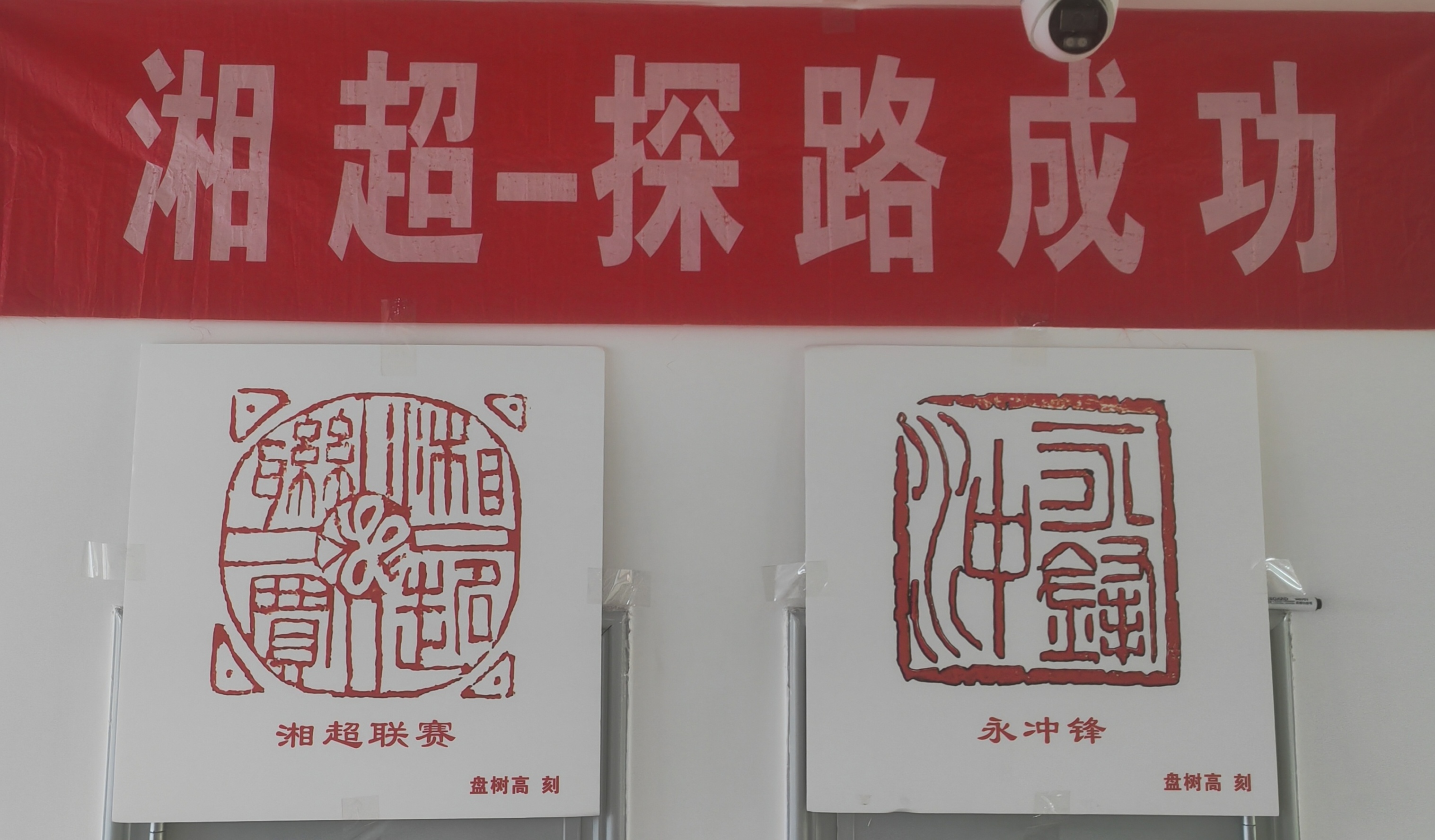 1月30日,湖南省永州市文联副主席、检察官文联主席盘树高向湘超冠军球员唐嘉年、林昊和谷文杰赠送红色革命历史题材《探路》长篇小说、篆刻名章和“永州门神”“带刀后卫”“零陵箭”书法作品,展现足球竞技魅力和永冲锋精神。盘树高以刀做笔,为冠军运动员篆刻名章,书写雅号,创作了10余幅湘超联赛主题篆刻作品,将足球和传统文化紧密结合,被永州潇湘国际大酒店、长沙、北京的一些企业家放大挂在显耀位置推广宣传,引起一定社会反响。此次赠送“冠军印”活动对于弘扬中华优秀传统文化和中华体育精神有着重要意义,将鼓舞和激励湘超永州健儿发扬永冲锋精神,在今年的赛场继续为家乡而战、为湘超争光。
