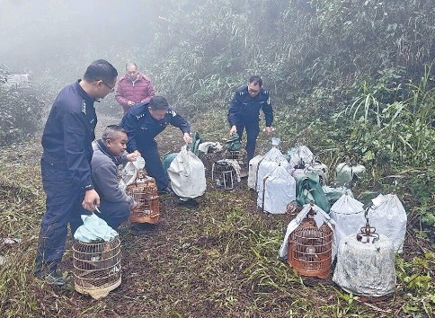 2026年2月23日上午,一场野外放生活动在山间密林中悄然进行。放生现场,凌云县公安局民警与野生动物保护站工作人员小心翼翼打开鸟笼,伴随着清脆的鸟鸣,27只野生画眉鸟展翅飞向密林,回到了属于它们的自然家园。