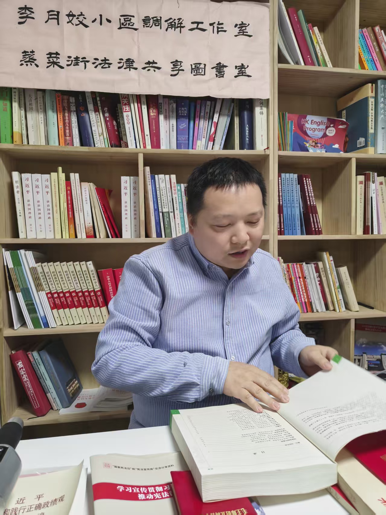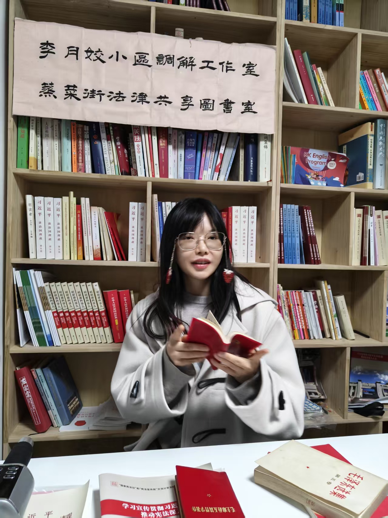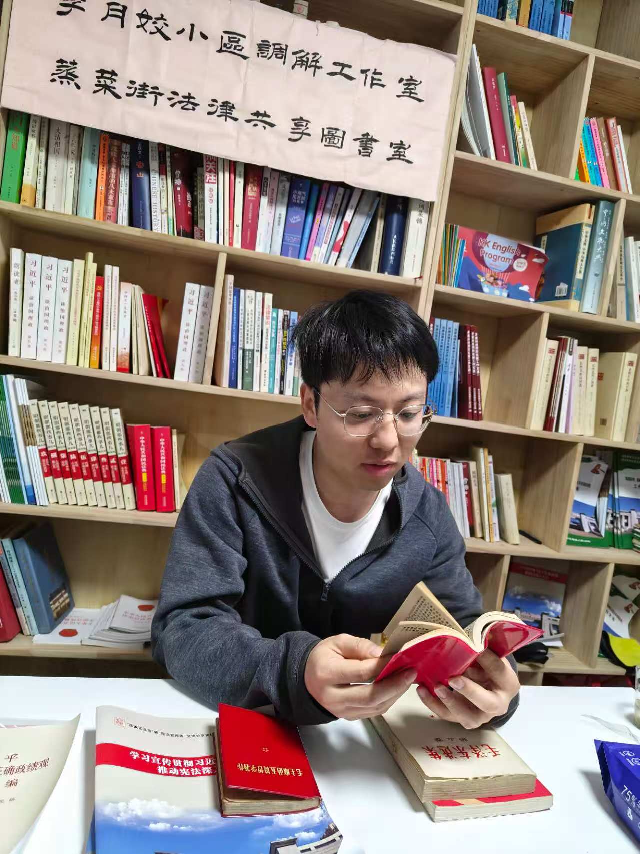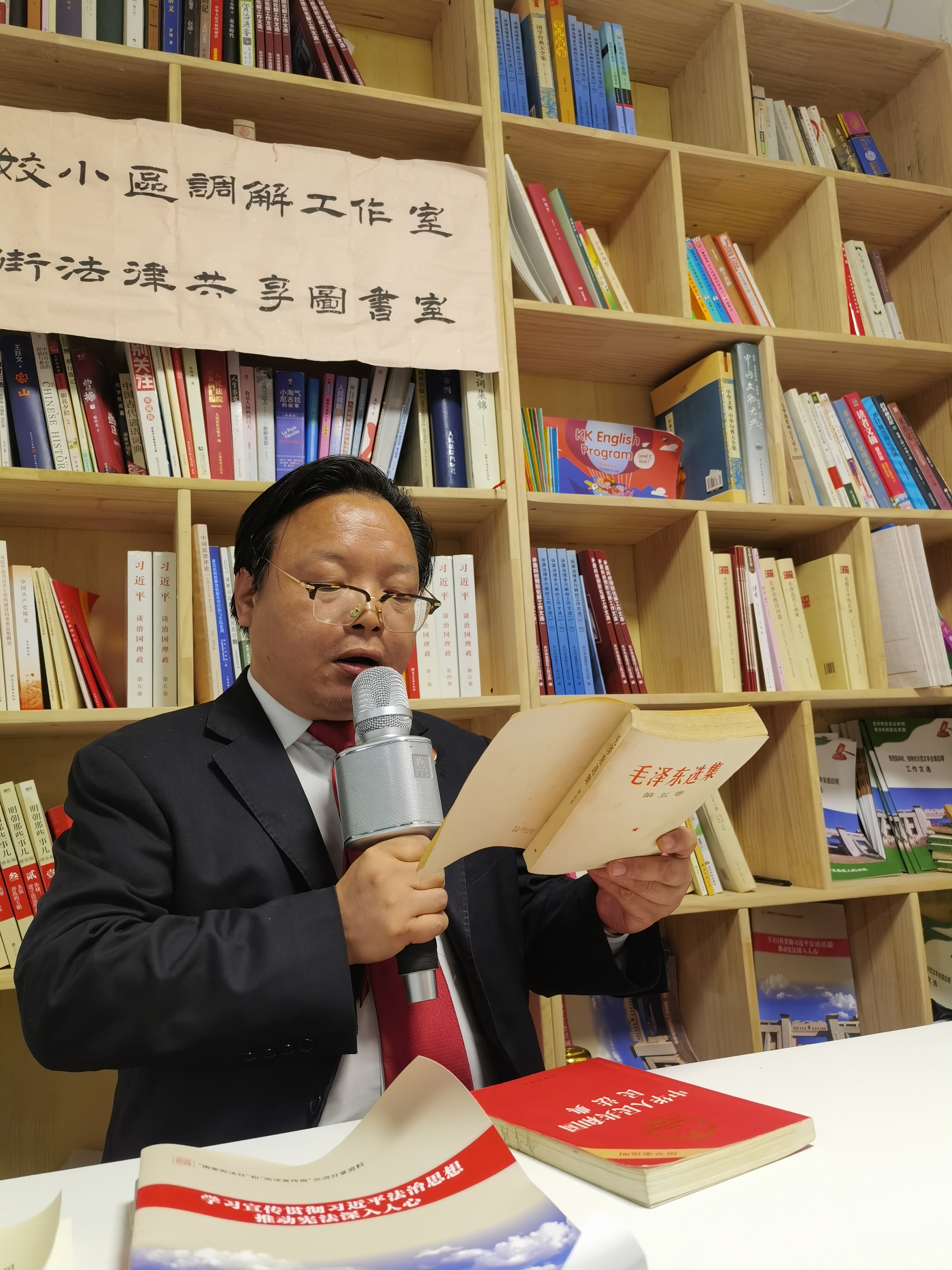 活动中,芙蓉区“金牌调解员”欧阳婷深情朗读了《礼记﹒礼运》篇中的《大道之行天下为公》选段,探讨两千多年前的古人智慧对当今法治建设的指导意义。钟建林带着无比崇敬的心情朗读《毛泽东选集》中的名篇《一切反动派都是纸老虎》,交流其中的辩证法思想,并朗读《民法典》前十条内容,倡导民法基本精神。斯黛结合自身工作实践,分享了对《毛主席语录》中有关“群众路线”和“调查研究”内容的理解。大家都选择自己喜欢的经典篇章深情朗读,畅所欲言交流心得,气氛温馨而热烈。琅琅书声在图书室里回荡,引发深深的共鸣与思考。
